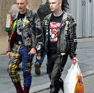 La silhouette rigide et coincée, l’uniforme du gentleman sont généreusement remplacées par les artifices de la génération punk. Sac à patates troué, florilège de colifichets plantés, accrochés, enchâssées dans tout lambeau de peau encore apparent au milieu des tatouages et peintures étranges, symboles, sans doute, de l’appartenance à un club, une secte, un clan…Cheveux colorés fluo …